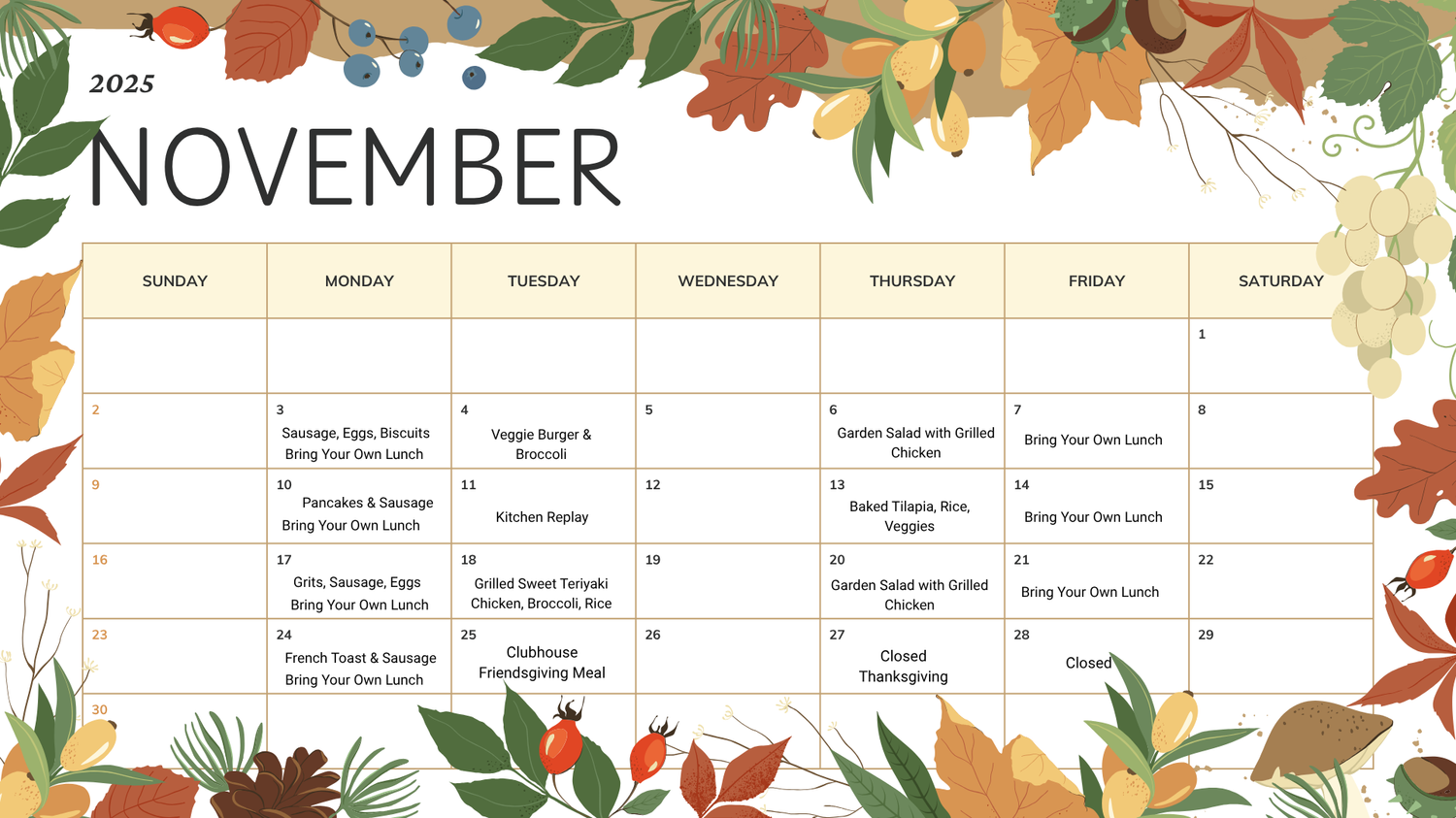 - Tuesdays & Thursdays: Clubhouse will provide a nutritious lunch